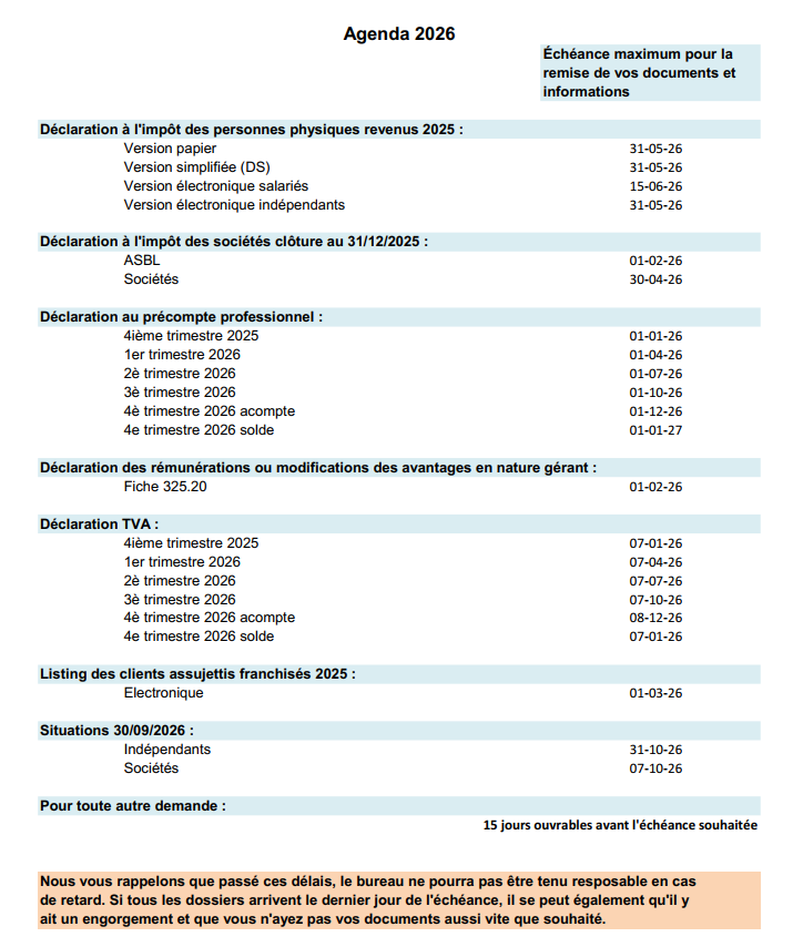Nous vous rappelons que nous sommes en congé durant toutes les périodes de congés scolaires (automne, hiver, détente, printemps, été), durant toutes les journées fériés, et que nous prendrons d’autres congés durant l’année. Durant ces périodes de congés aucune permanence n’est assurée.Afin de pouvoir respecter les échéances fiscales, nous vous mettons à disposition sur notre site chaque année l’agenda avec les échéances obligatoires pour nous remettre les documents. Merci de respecter ces échéances, sans quoi, BUCOMPTA ne pourra pas être tenu responsable des retards et conséquences qui en découleraient.